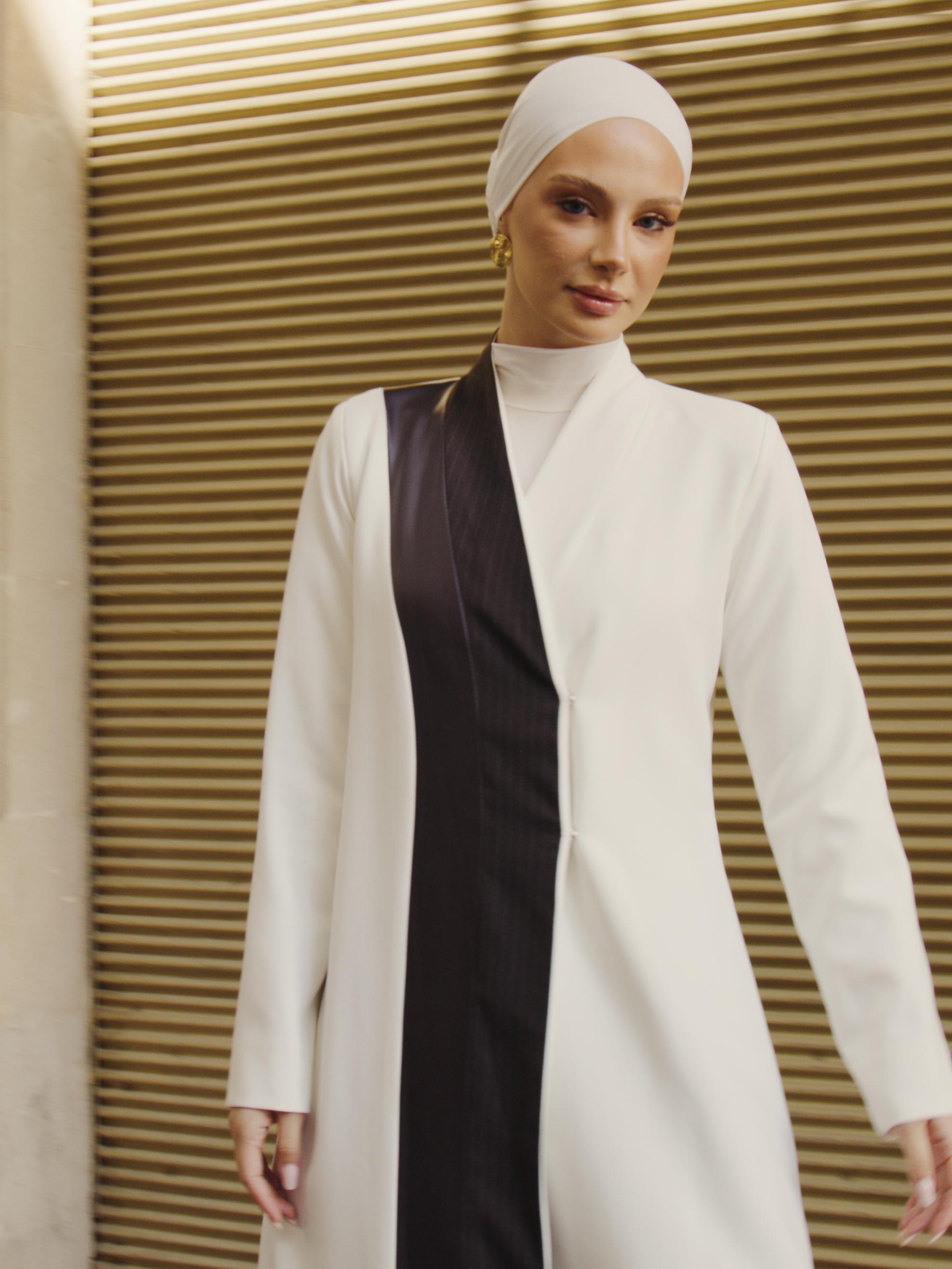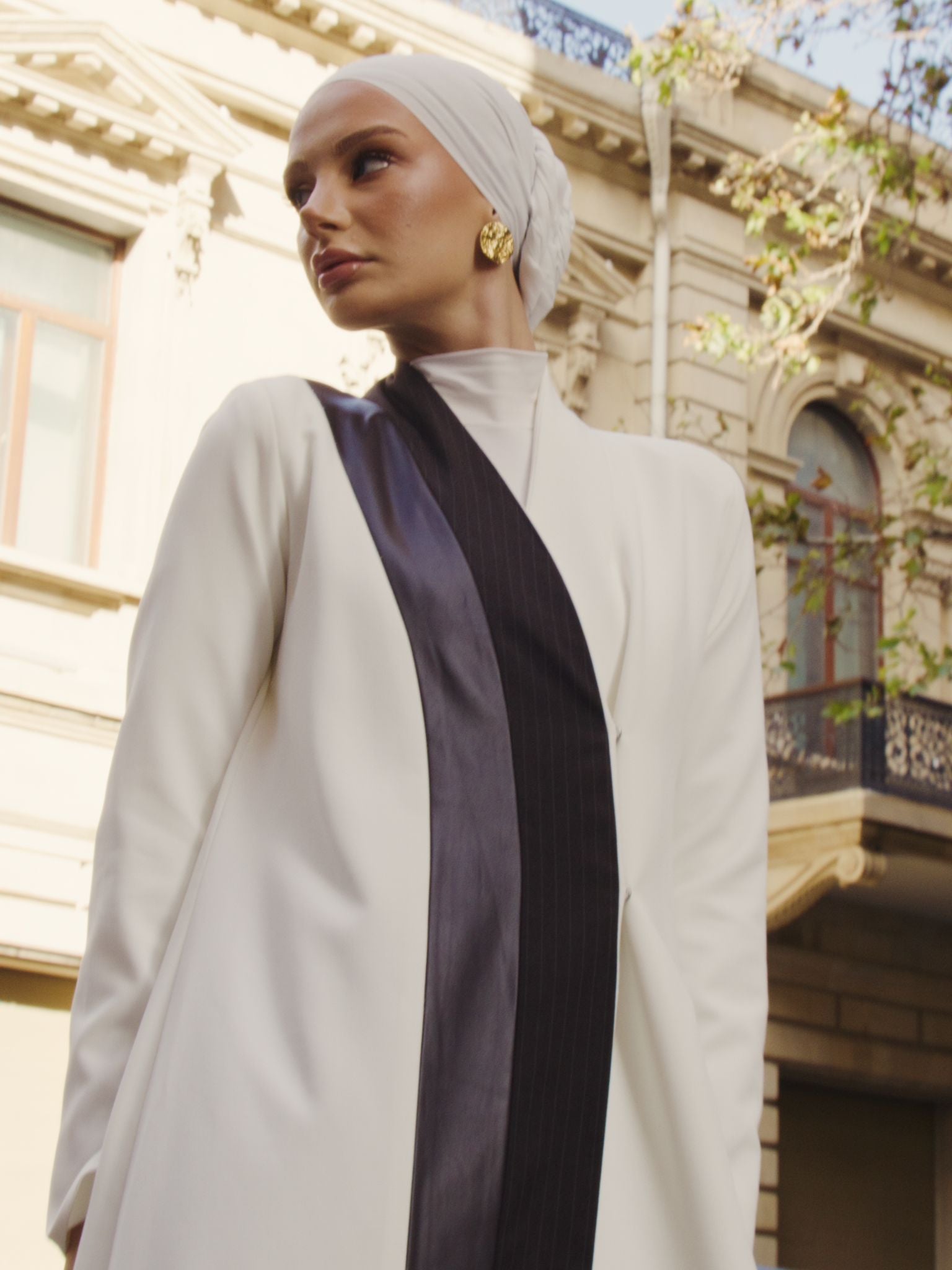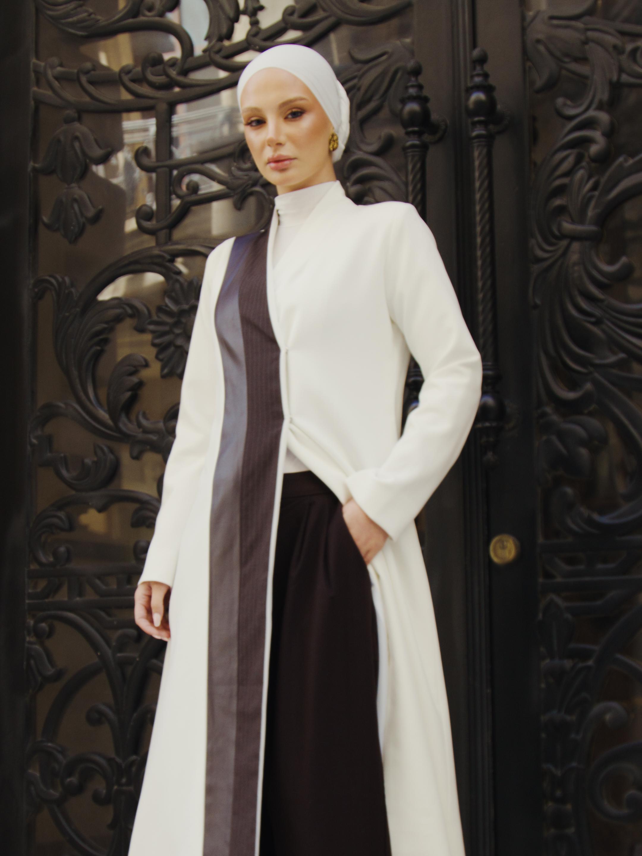 White coat with a touch of striped cashmere and dark brown leather.